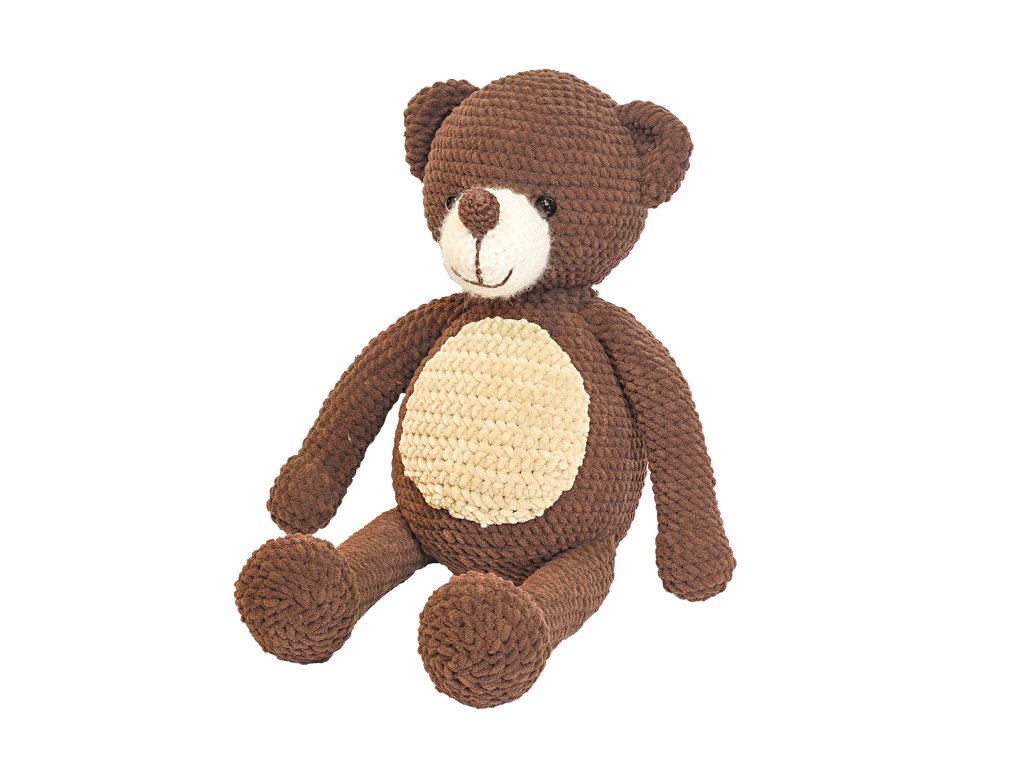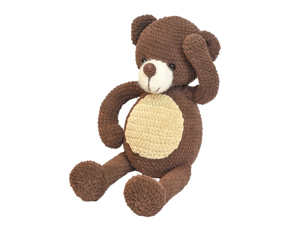 Návod je zcela zdarma. Medvěd má jednoduché, čisté tvary, díky kterým vznikne krásný a nadčasový plyšák. Použití žinylkové příze zaručuje extra jemný a luxusní vzhled.