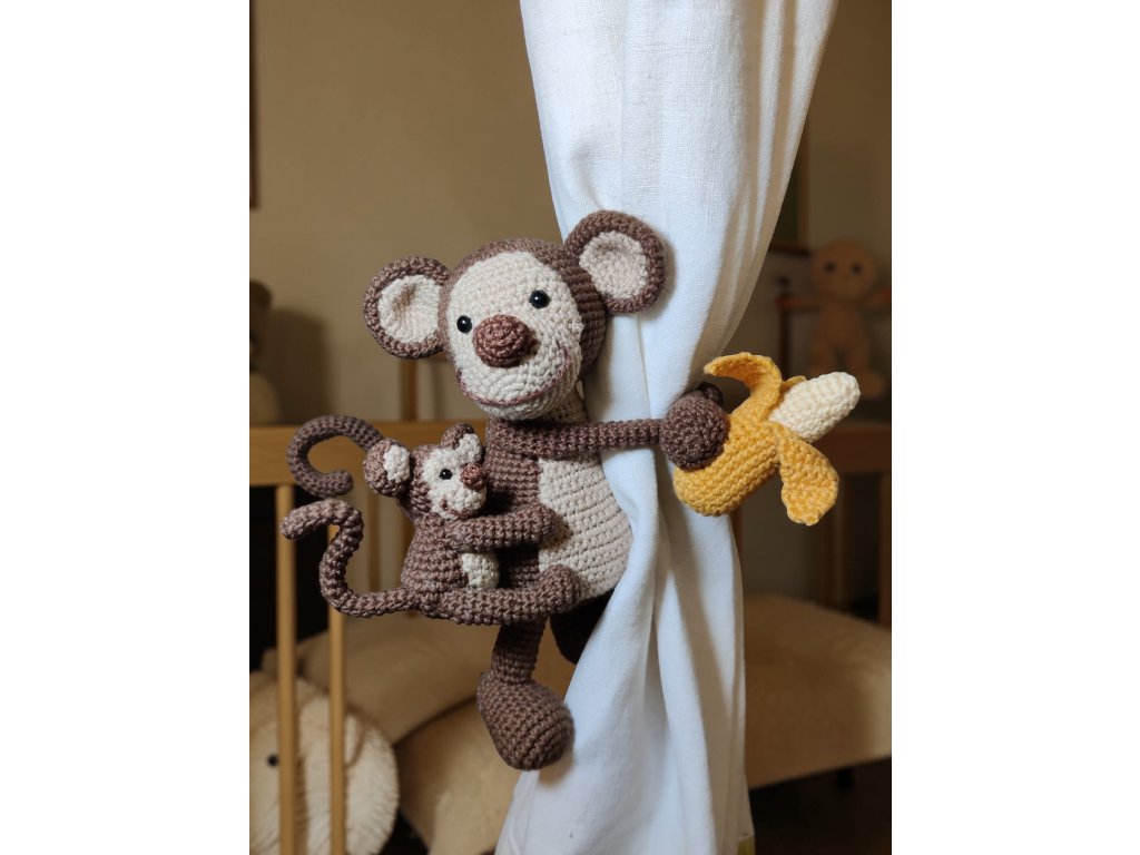 Opička, co drží závěs, banán i nervy pohromadě. Na zádech mládě, v ruce svačina, v očích klid džungle.