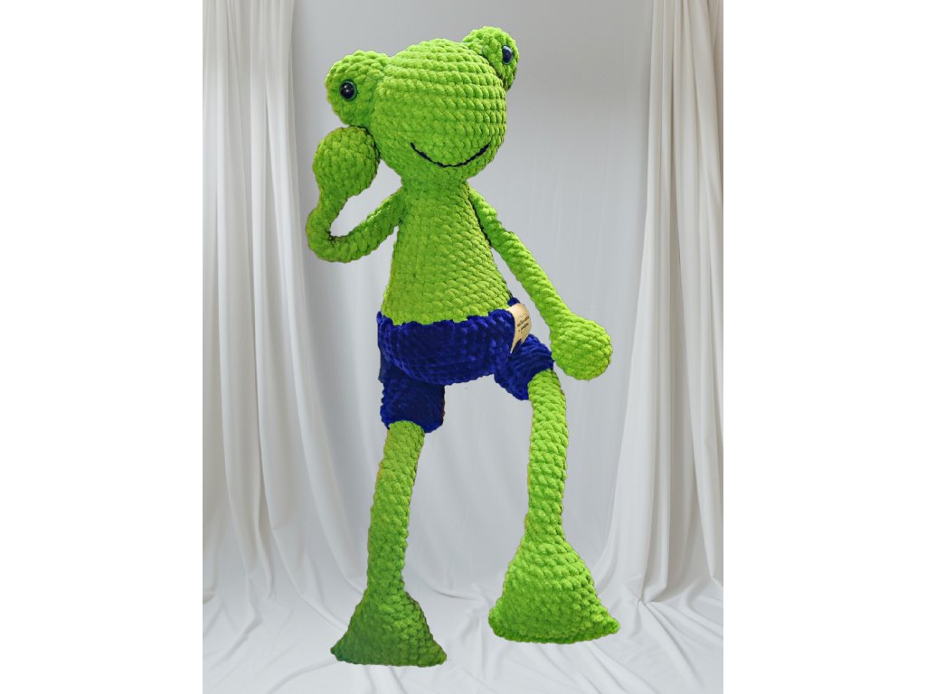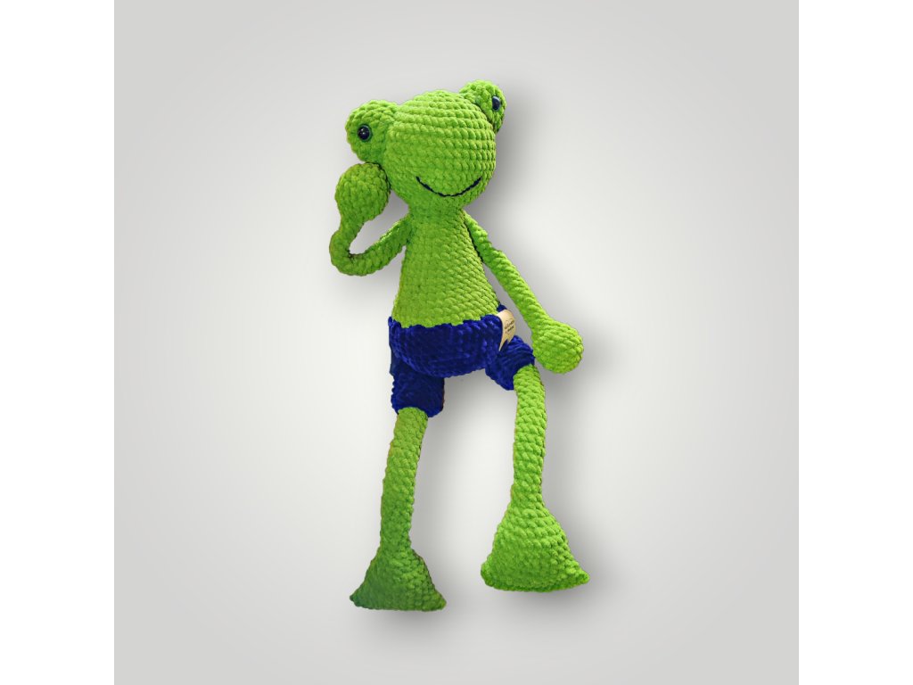 Jemný a měkoučký háčkovaný žabák ze žinylové příze je jako stvořený pro mazlení a klidné usínání. Díky hebkému materiálu se skvěle hodí jako uspávací hračka pro malé i větší děti. Roztomilý vzhled doplňují modré kraťasy, které mu dodávají hravý charakter. Návod je přehledný a provede vás krok za krokem celým postupem výroby.